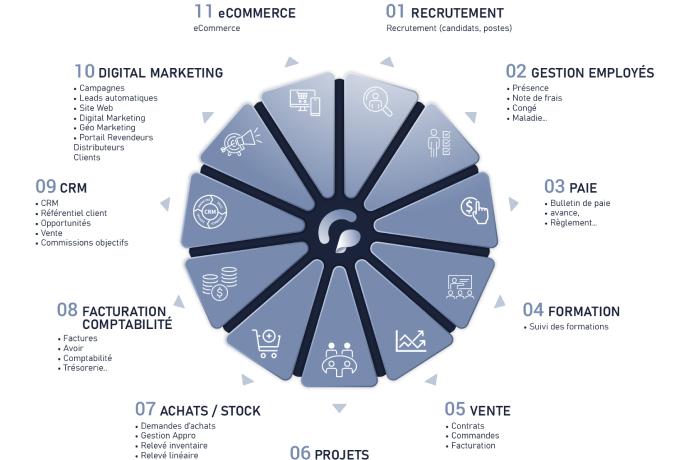 ERP : Gestion du recrutement, Gestion des ressources humaines, Achat, Vente, Gestion de stocks, Inventaire, Facturation, Comptabilité…